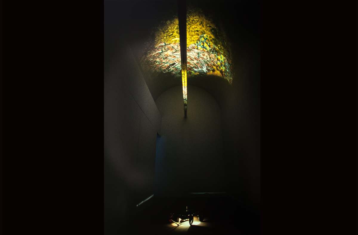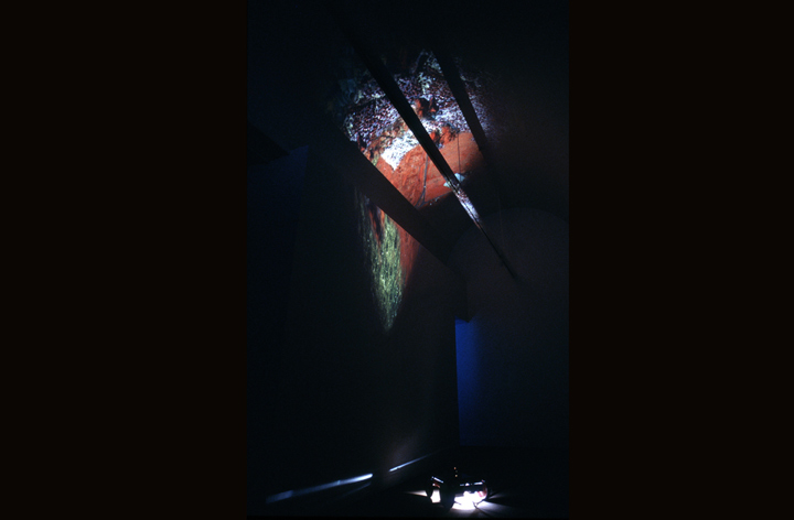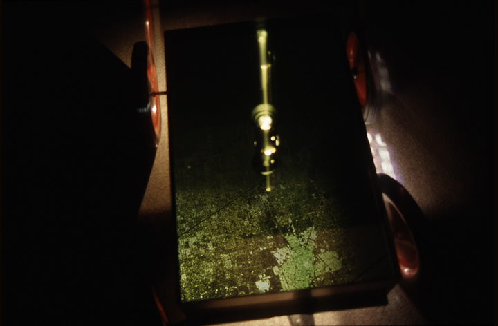 Room for Walking is created from one still image, unearthed bit by bit. The image itself is a carefully constructed composite of remotely-sensed imagery, consisting of satellite and aerial photography of the gallery location. Stored on a large digital film inside the work, the image is manipulated dynamically by a computer-based servo control.