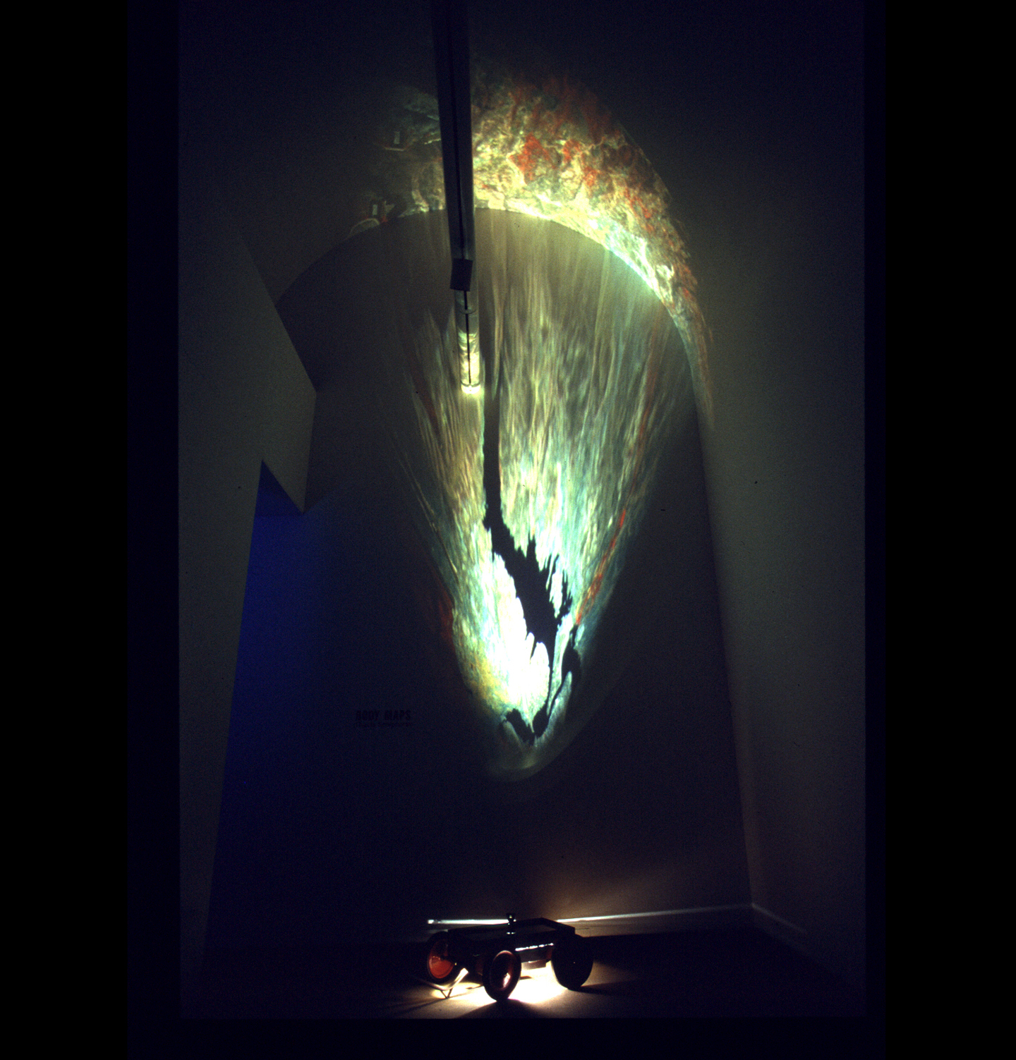On entering an almost empty exhibition space, a viewer encounters only a small, wheeled cart. This is the physical interface for viewing and experiencing Room for Walking. The cart resembles, on a slightly larger scale, a child's wagon. At the base of the cart is a servo-controlled projection system, hidden beneath a flat mirror. The viewer is able to move the piece to anywhere in the gallery by means of a handle. Upon moving the cart, an image is projected from inside the cart, with the resultant projection bouncing to the ceiling and back into the mirror.